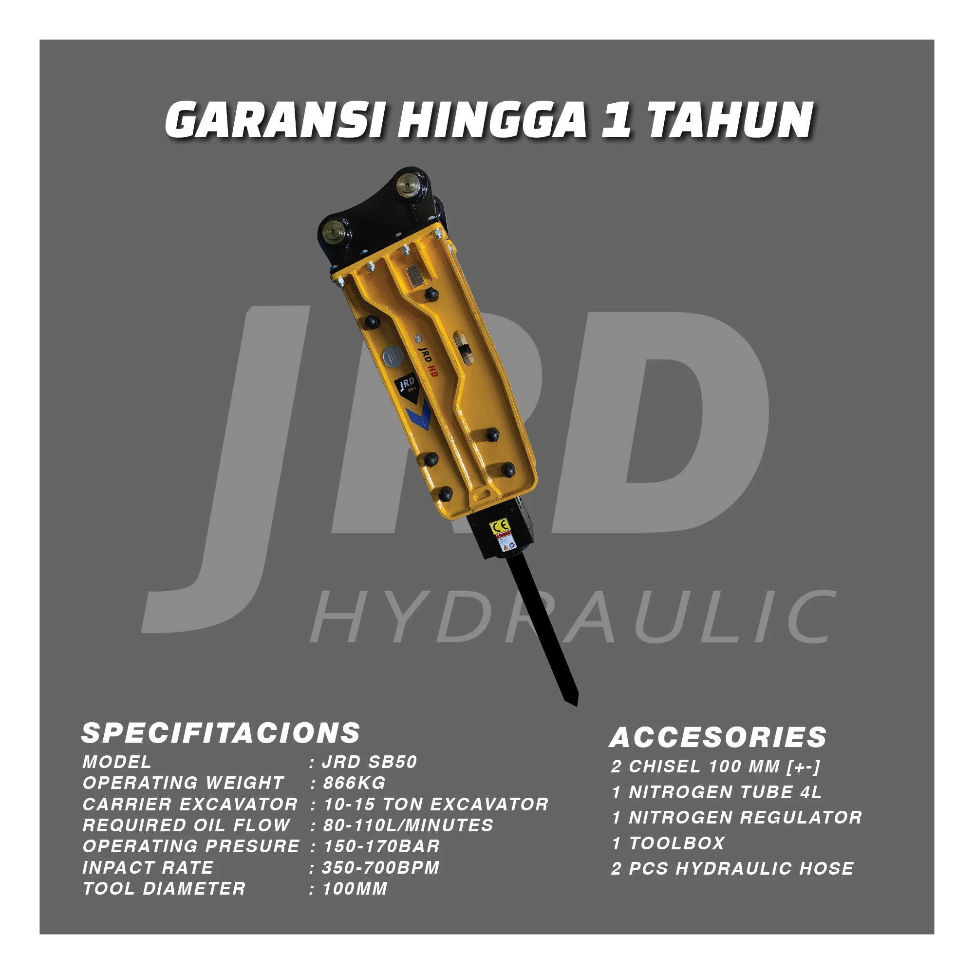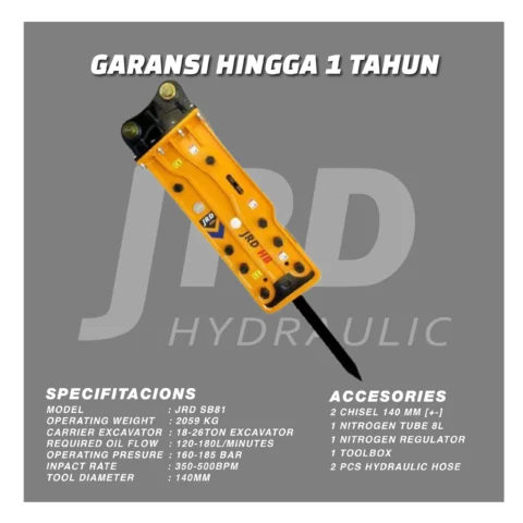Hydraulic Breaker JRD SB81 adalah palu hidrolik kelas menengah hingga berat yang dirancang untuk menghancurkan material keras seperti beton, batu, dan aspal dengan efisiensi tinggi. Cocok digunakan pada excavator kelas 18–26 ton, unit ini menawarkan daya hancur yang kuat, struktur yang kokoh, dan sistem redaman getaran untuk meningkatkan kenyamanan serta memperpanjang usia alat. JRD SB81 merupakan pilihan tepat untuk pekerjaan pembongkaran, pertambangan, dan konstruksi berat yang membutuhkan performa stabil dan perawatan minimal.