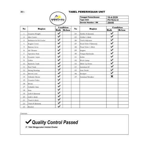 | Jaminan & Layanan Unit | Full Maintenance: Perawatan penuh untuk menjaga performa unit Full General Service: Semua unit telah melalui servis menyeluruh Siap Kerja: Unit langsung siap digunakan di lapangan Jaminan Jasa Mekanik & Support Part: Didukung oleh tim mekanik profesional dan sparepart terjamin Invoice Atas Nama Pembeli: Legalitas & transaksi aman dengan invoice resmi Jaminan Mesin, Pompa & Transmisi Original: Komatsu original, segel utuh, belum pernah bongkar/overhaul Jaminan Semua Secondary Part Berfungsi Maksimal: Sistem hidraulik, kelistrikan, & fitur lain dalam kondisi prima Bebas Request Penyempurnaan: Bisa disesuaikan dengan kebutuhan hingga pelanggan puas Import Ex-Japan, Original Built-Up 2025: Unit fresh, belum pernah dipakai di Indonesia |